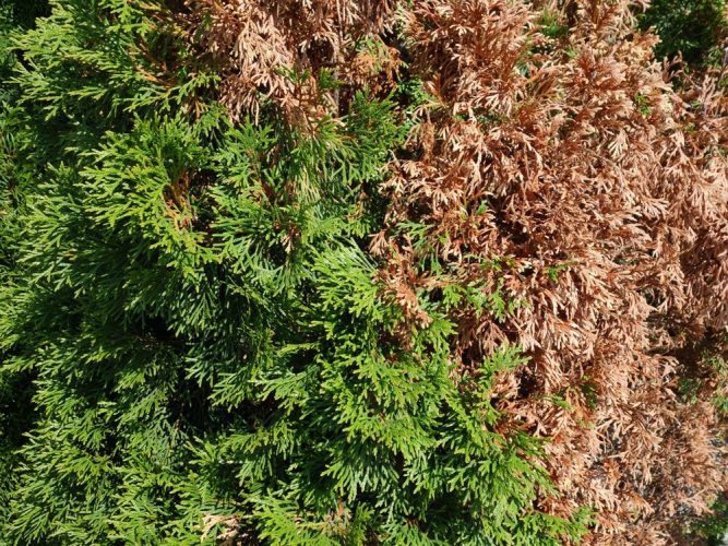 Сухі, ламкі гілочки видаляють, а місця зрізів обмазують варом. У деяких випадках допомагає пересаджування на нове місце. За весняних опіків допомагає рясний полив, а також рослини «заряджають» водою з осені. Якщо туї стали жовтіти через хвороби, комах, проводиться професійна обробка хвойних від шкідників.