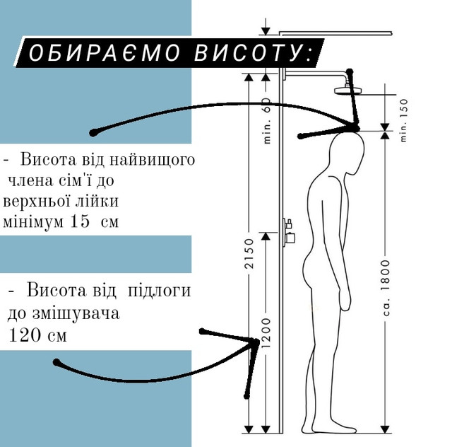 Висота змішувача в душі залежить від зросту членів родини. Стандартна висота, яка буде зручною та оптимальною для всіх – від 110 до 130 сантиме …