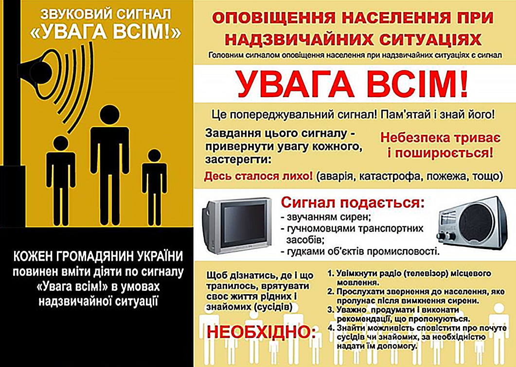 Для привернення уваги, перед доведенням інформації до населення про загрозу виникнення або виникнення надзвичайної ситуації, передається попереджувальний сигнал “Увага всім”, а саме: уривчасте звучання електросирен, часті гудки транспорту, зокрема у запису мережами радіомовлення та через вуличні гучномовні пристрої.