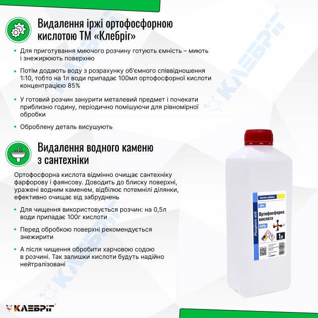 Ортофосфорна кислота Використовується у промисловості для видалення іржі на великих поверхнях. Її можна застосовувати і в домашніх умовах: достатньо розвести концентрат у співвідношенні 1:10 з водою. Отриманий розчин ефективно знімає іржу і перетворює її на неактивне покриття.