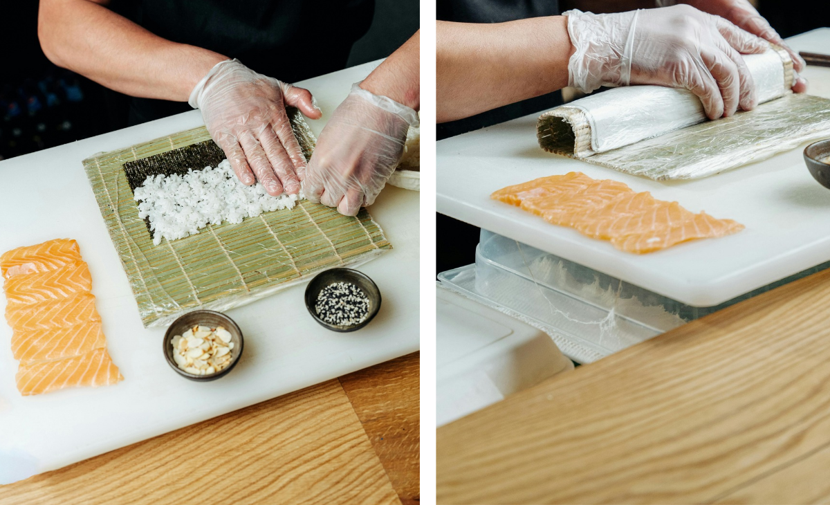 Зручніше всього скручувати рулет за допомогою килимка. Також знадобиться харчова плівка. Вона потрібна для обгортання килимка, щоб рис не прилипав до поверхні.