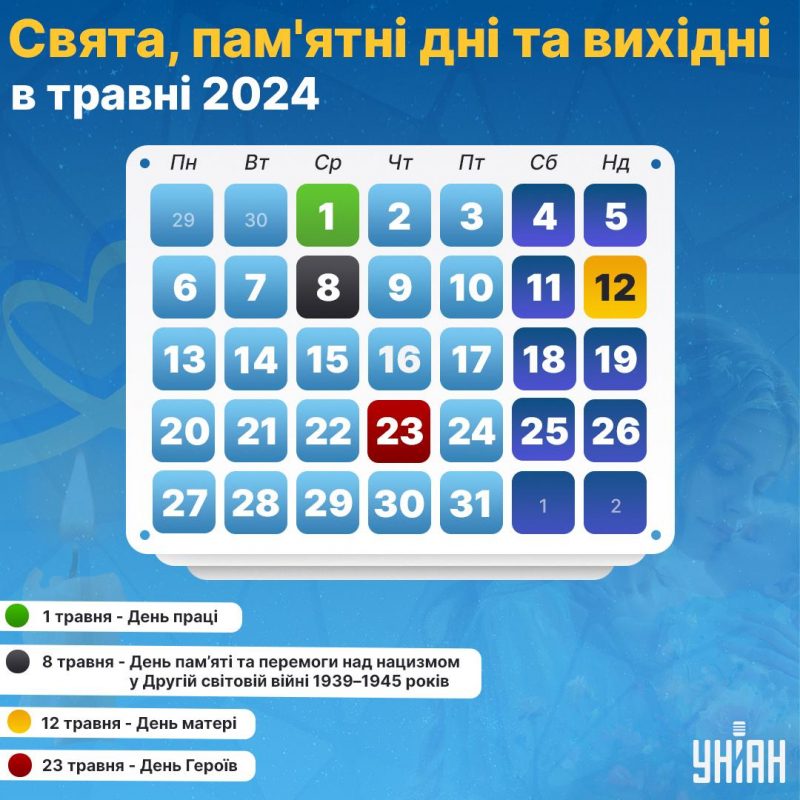 Традиційно в травні 2024 року буде 31 день, а з них – 23 робочих дні і 8 – офіційних вихідних (субота й неділя). Зазвичай у травні українці мають декілька додаткових вихідних – 1 травня (День праці) та 8 травня (День пам’яті та перемоги над нацизмом).