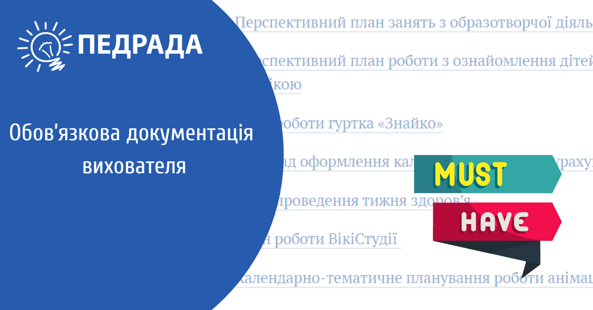 Які документи має заповнювати вихователь: план роботи, журнал обліку щоденного відвідування дітьми групи, книга відомостей про дітей та …